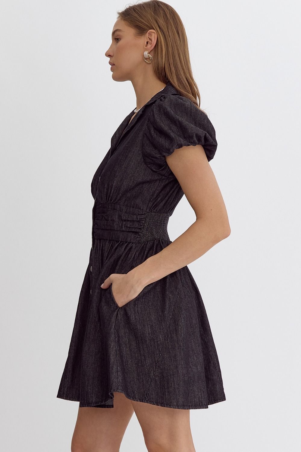 Denim short sleeve button-up mini dress featuring puff sleeves. Ruched waist. Smocking at back. Pockets at side. Unlined. Woven. Non-sheer. Lightweight.