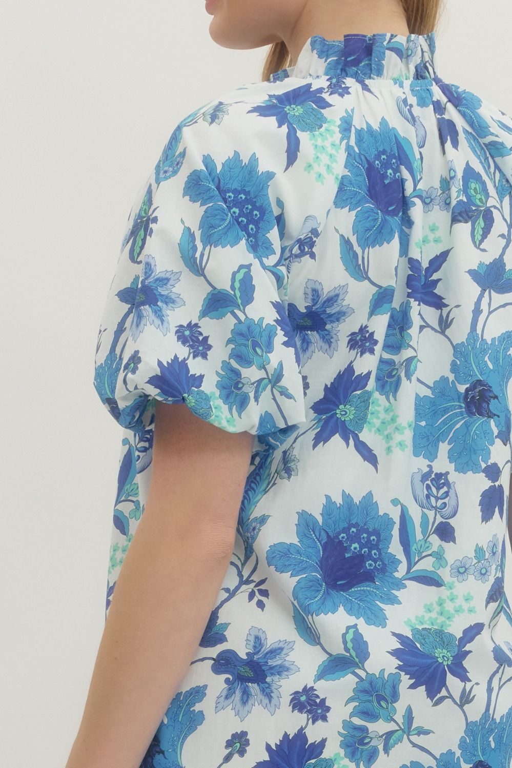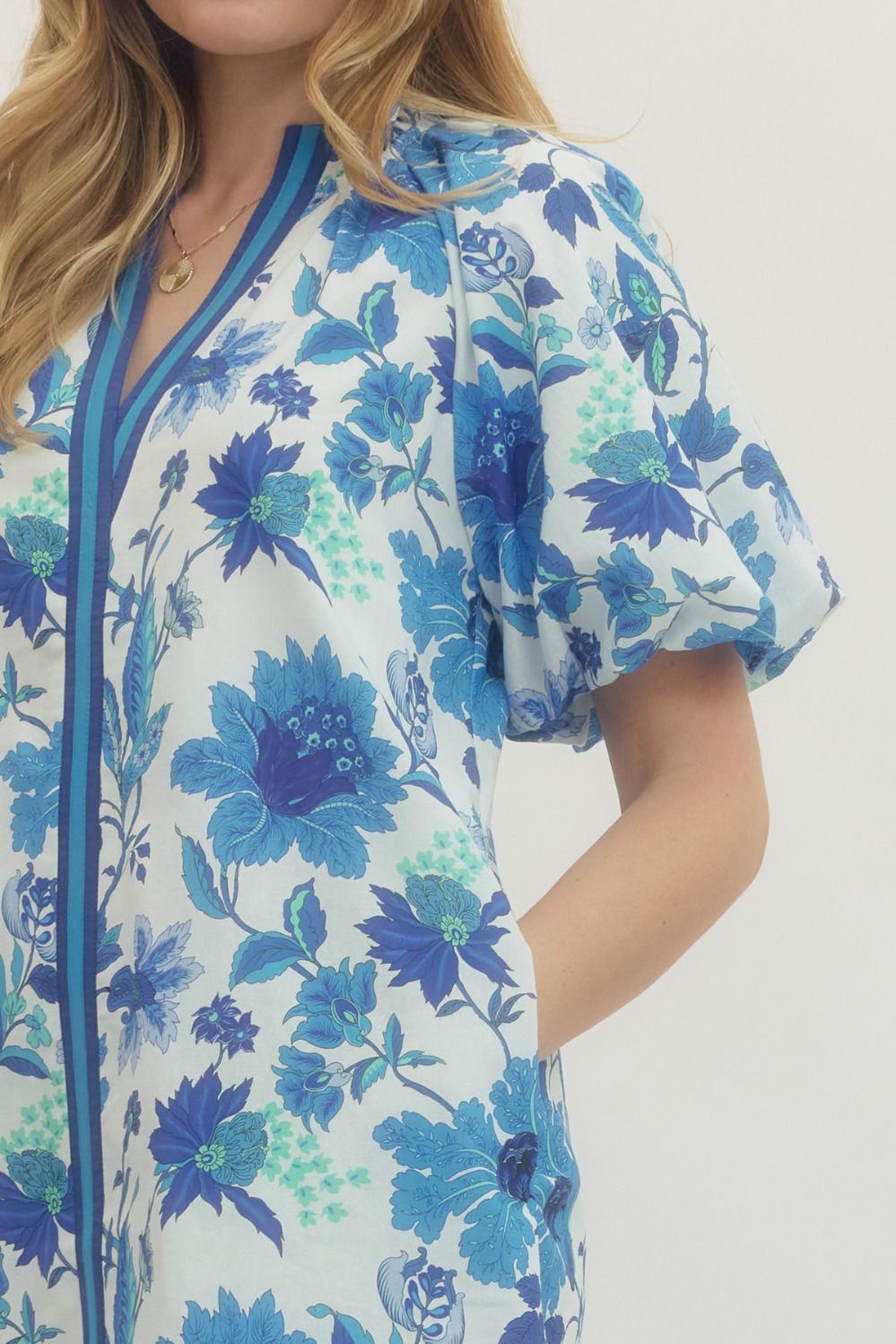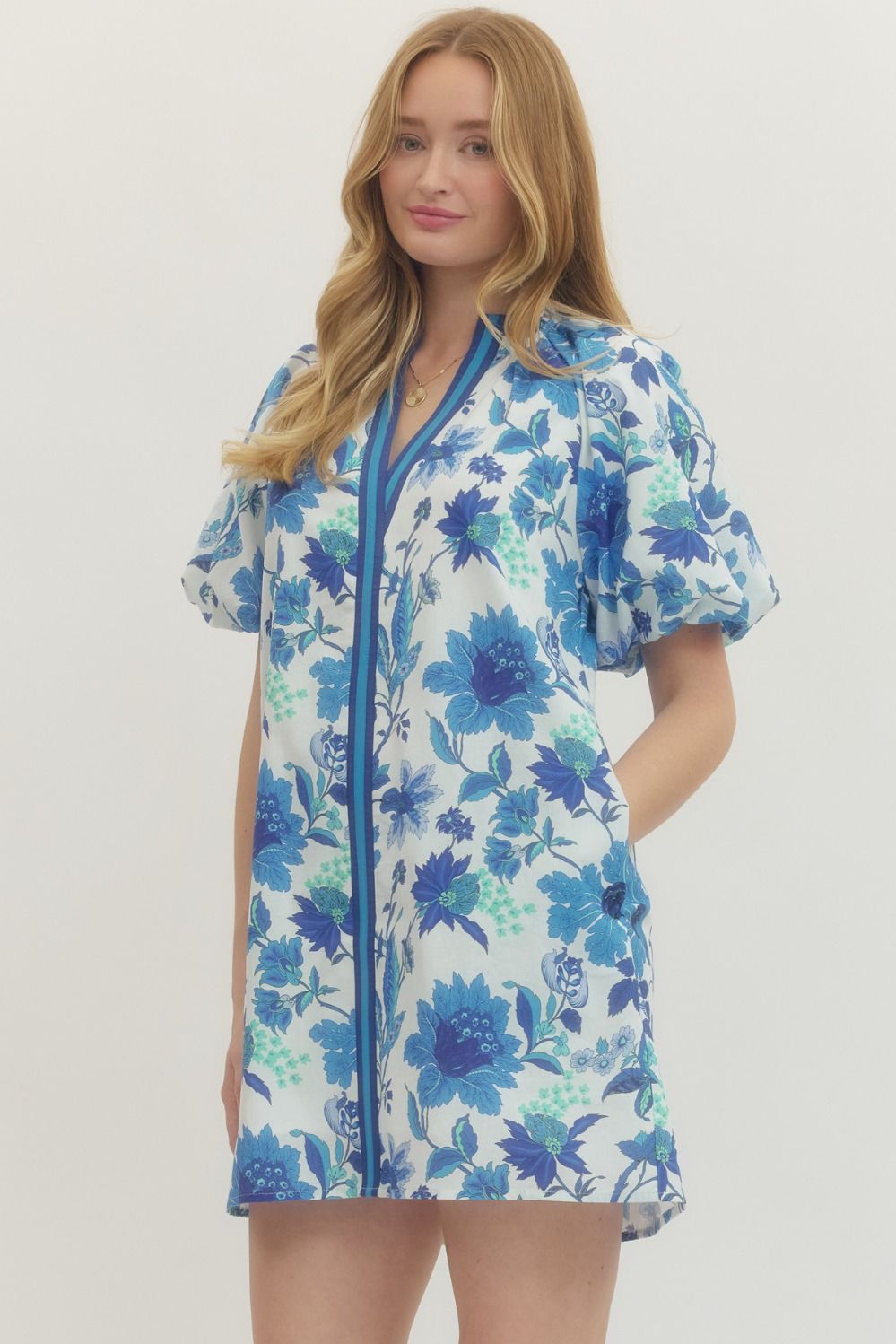 Botanical print short puff sleeve mini dress featuring contrast trim V-neck.Raglan sleeve design with elasticated sleeve opening. Side pockets. Lined. Woven. Non-sheer. Lightweight.