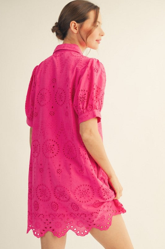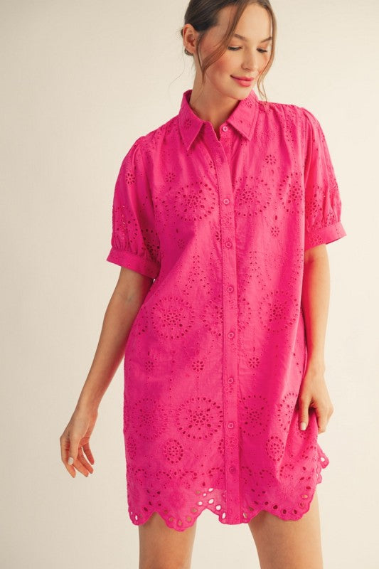Short sleeves button down eyelet dress with scallop hem, wide pockets. - Model is 5'10'' and is wearing a Small.