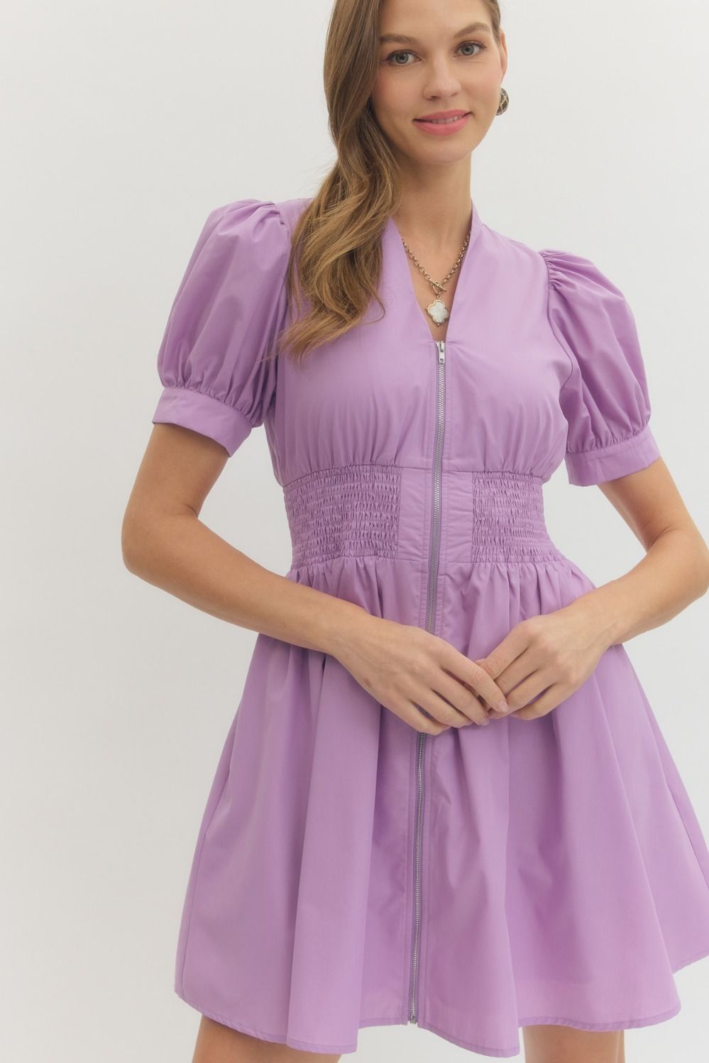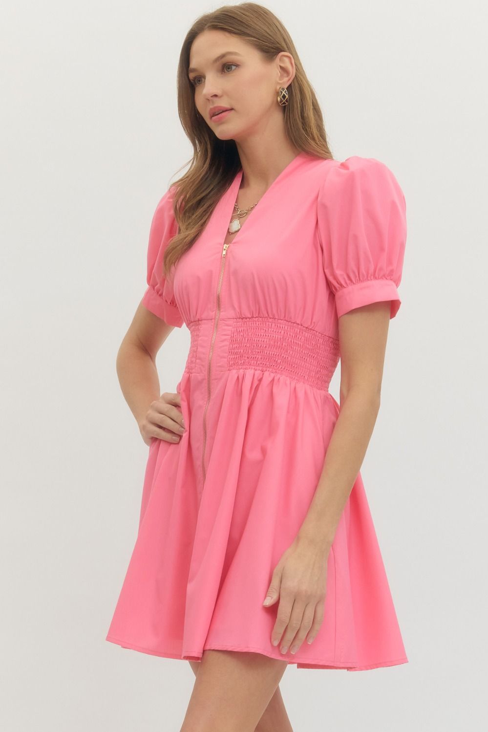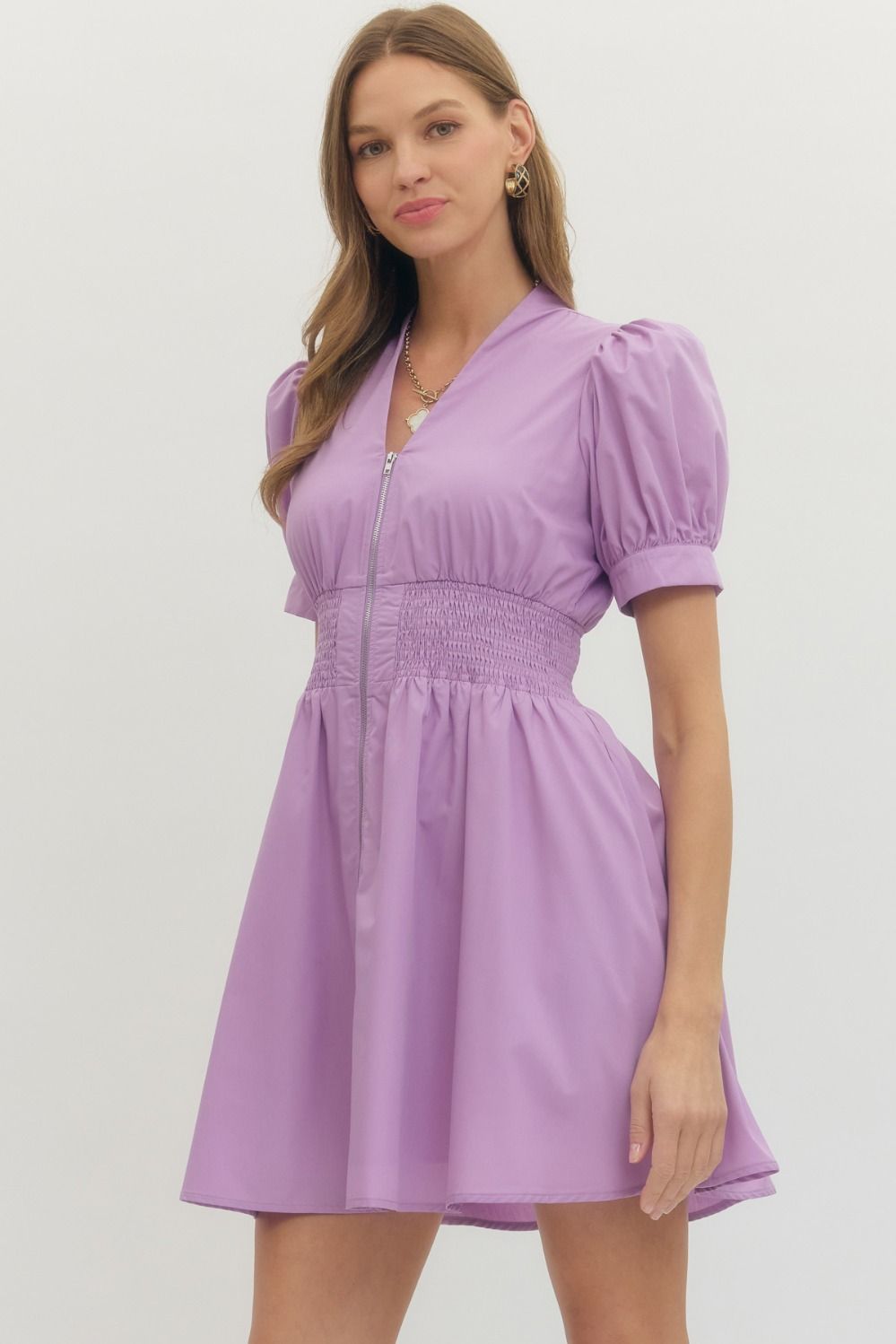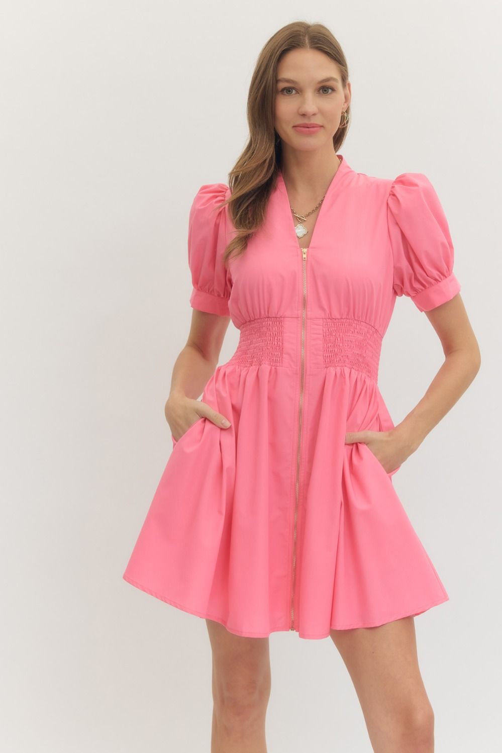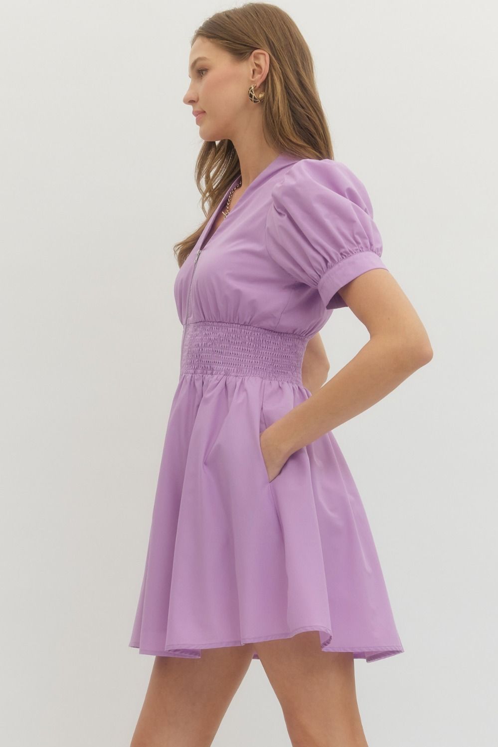 Solid short puff sleeve V-neck mini dress featuring smocked waist front-zip closure. Pockets at sides. Lined. Woven. Non-sheer. Lightweight.