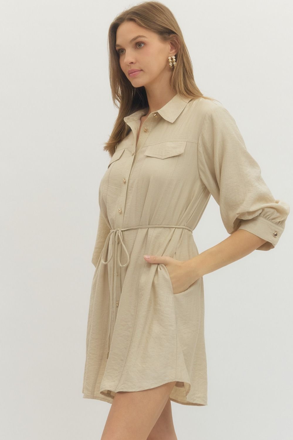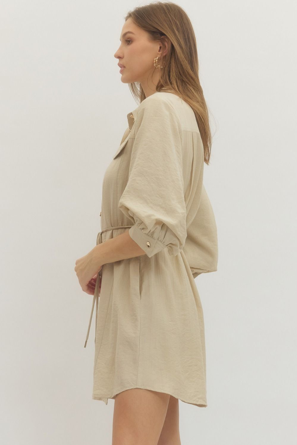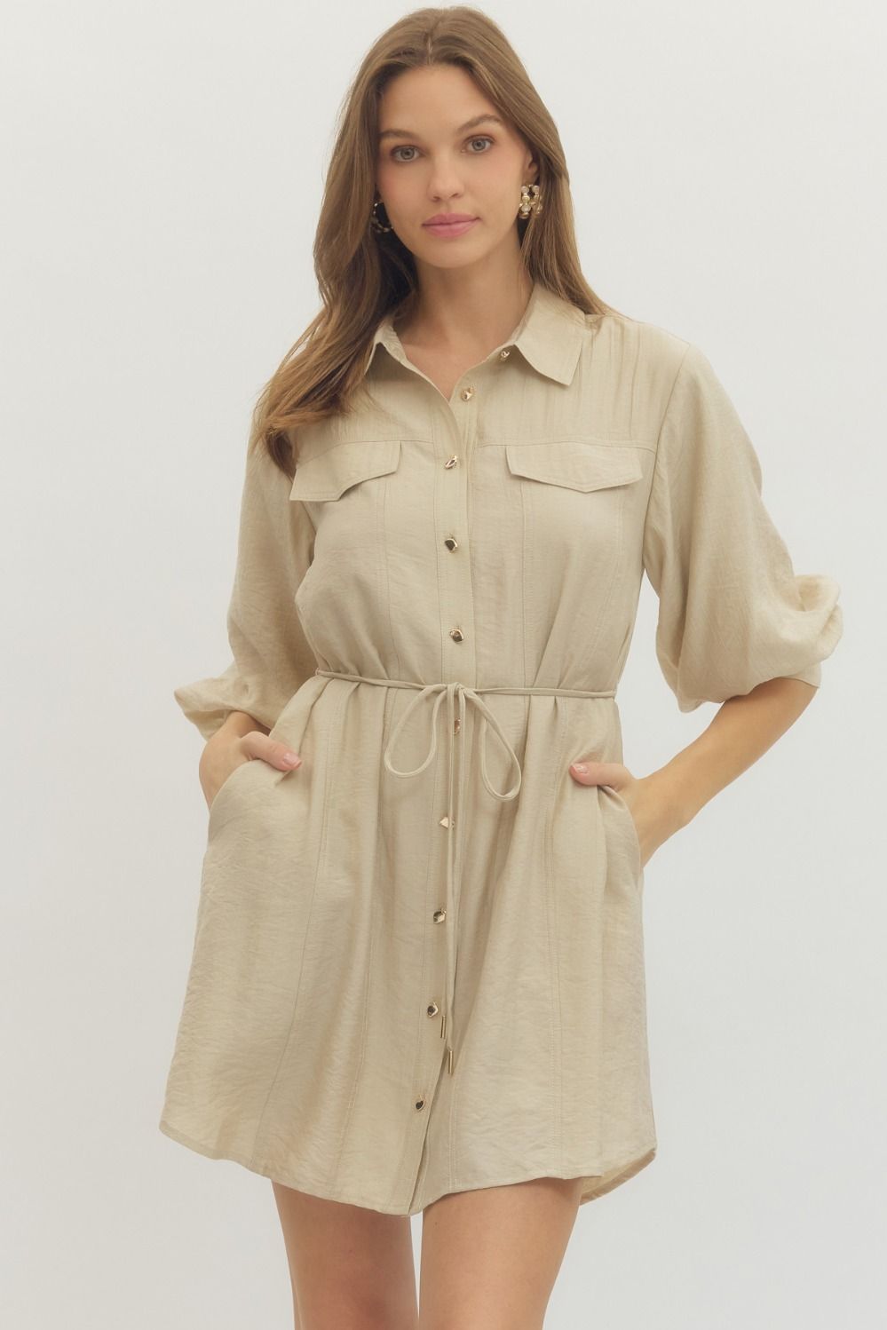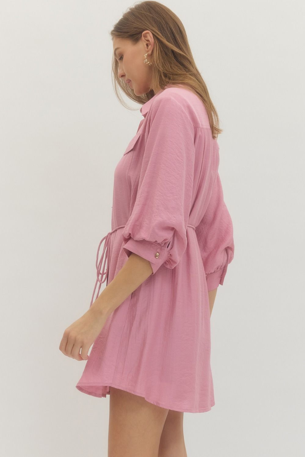 Solid long sleeve mini shirt dress featuring non-functional flap chest pocket detail, button closure at front, and adjustable waist tie. Buttoned cuffs. Side pockets. Lined. Woven. Non-sheer. Lightweight.