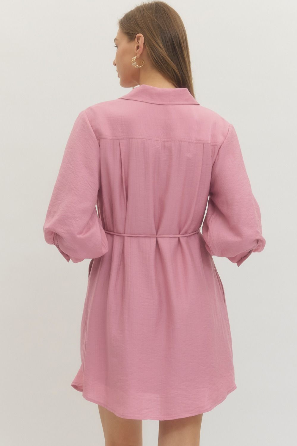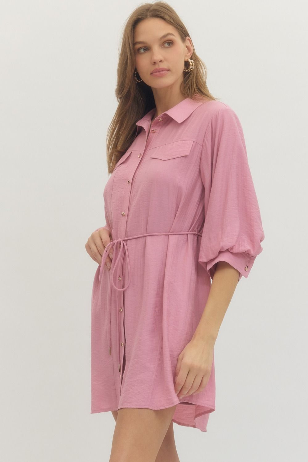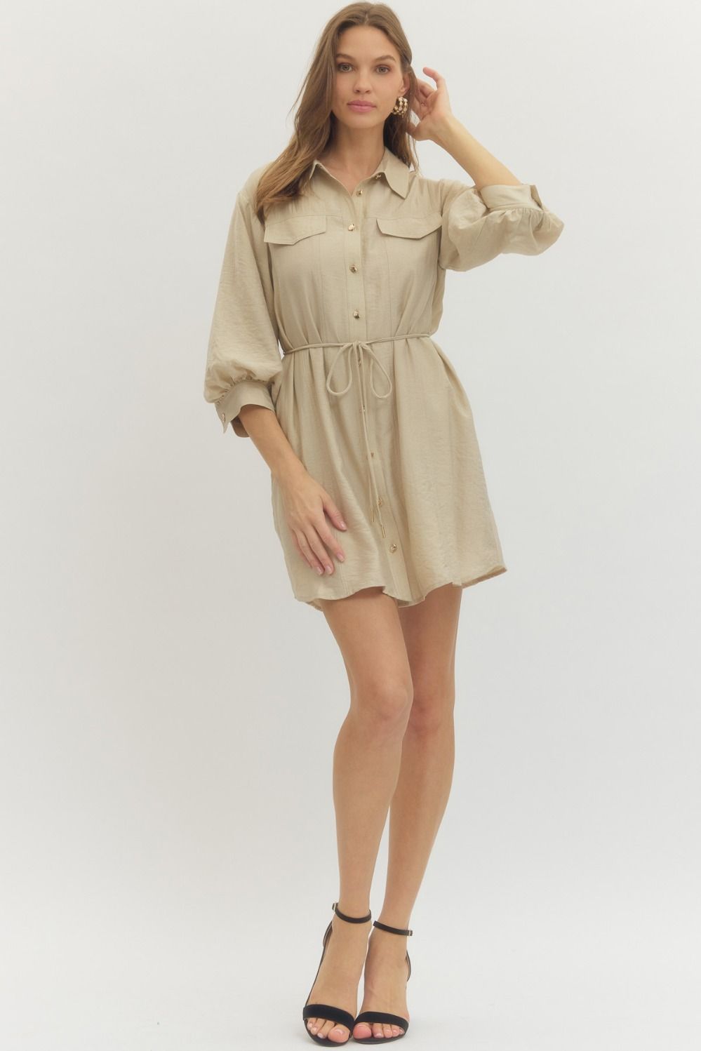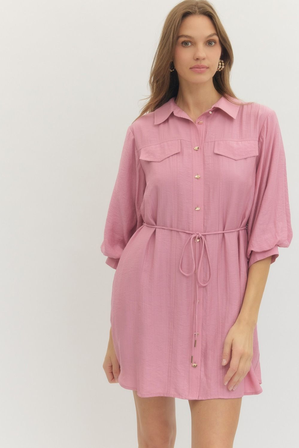 Solid long sleeve mini shirt dress featuring non-functional flap chest pocket detail, button closure at front, and adjustable waist tie. Buttoned cuffs. Side pockets. Lined. Woven. Non-sheer. Lightweight.