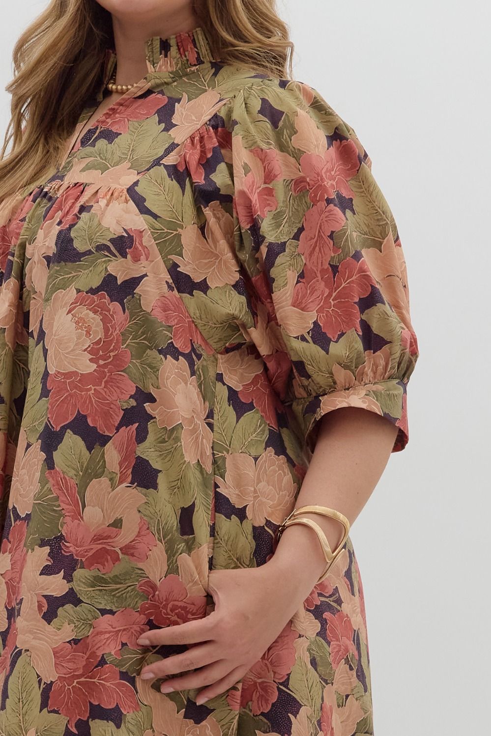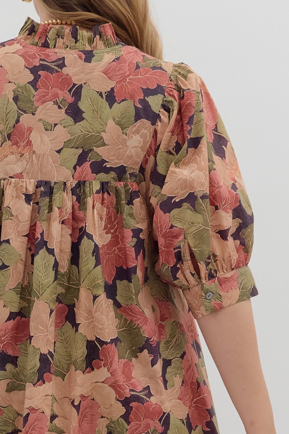 Floral pattern cuff band ¾ sleeve pullover mini dress featuring pleated accent neck ruffle. Pockets at sides. Lined. Woven. Non-sheer. Lightweight.