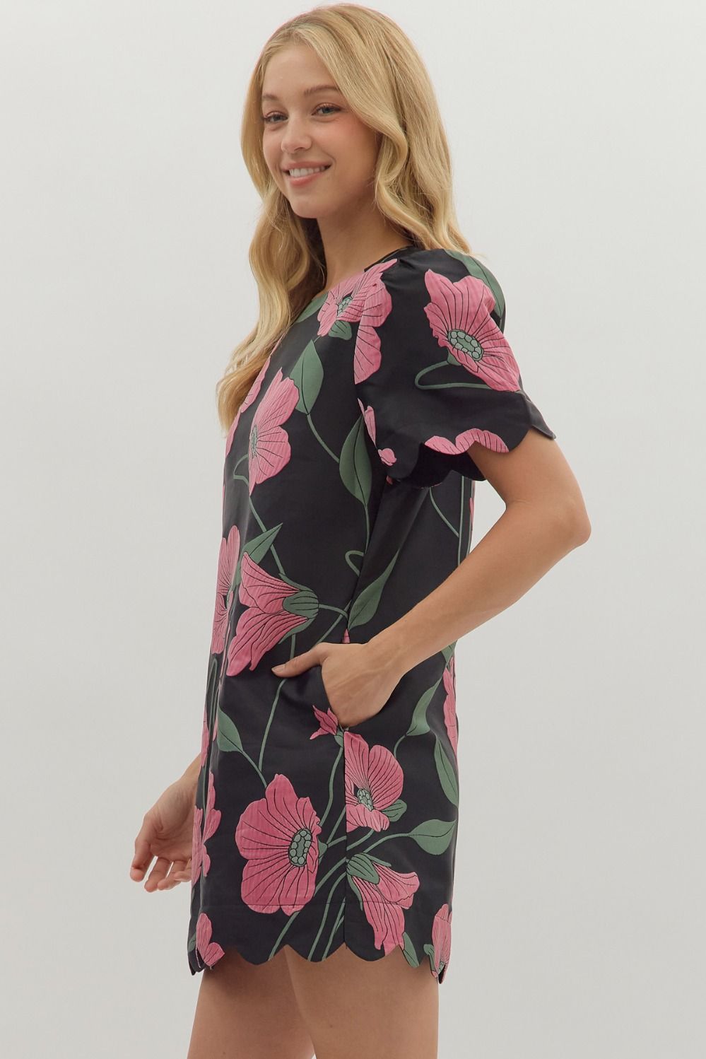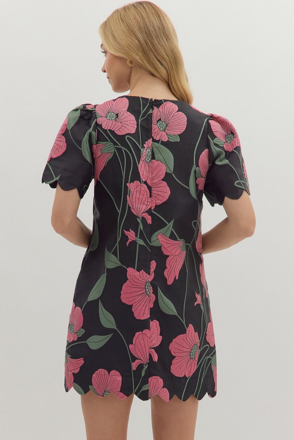 Floral jacquard short sleeve mini dress featuring scallop hem finish. Zipper closure at back. Pockets at sides. Lined. Woven. Non-sheer. Lightweight.