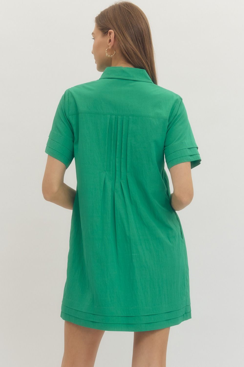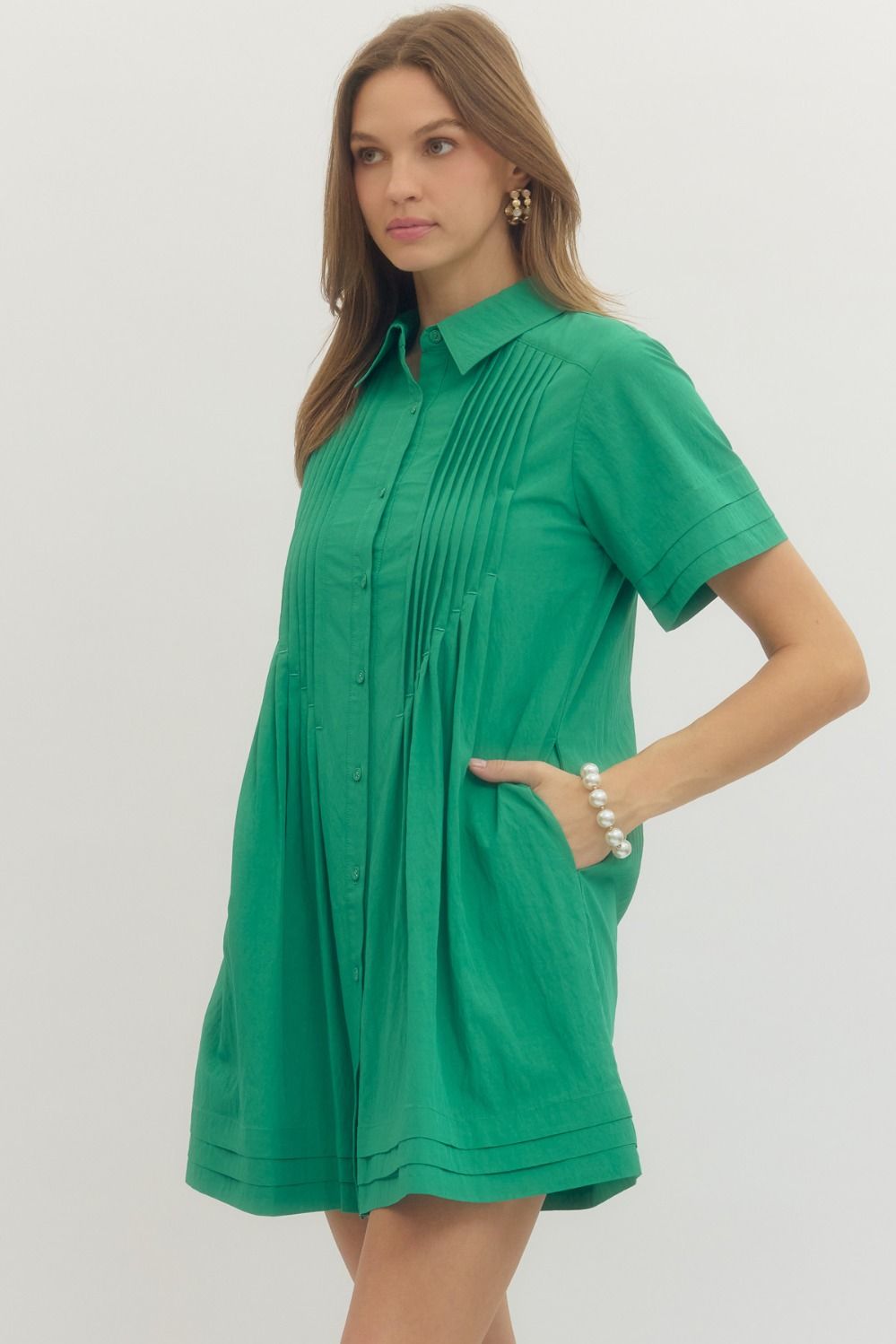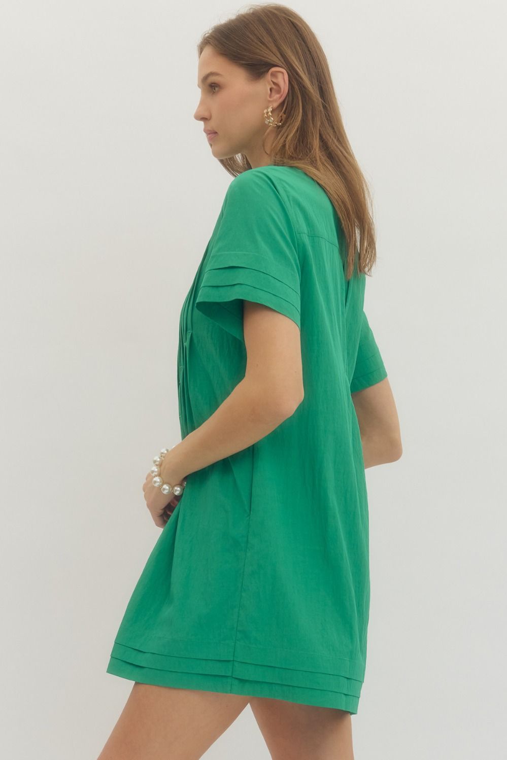 Solid short sleeve mini shirt dress featuring pintuck detail at front and back, button closure at front, and side pockets. Lined. Woven. Non-sheer. Lightweight.