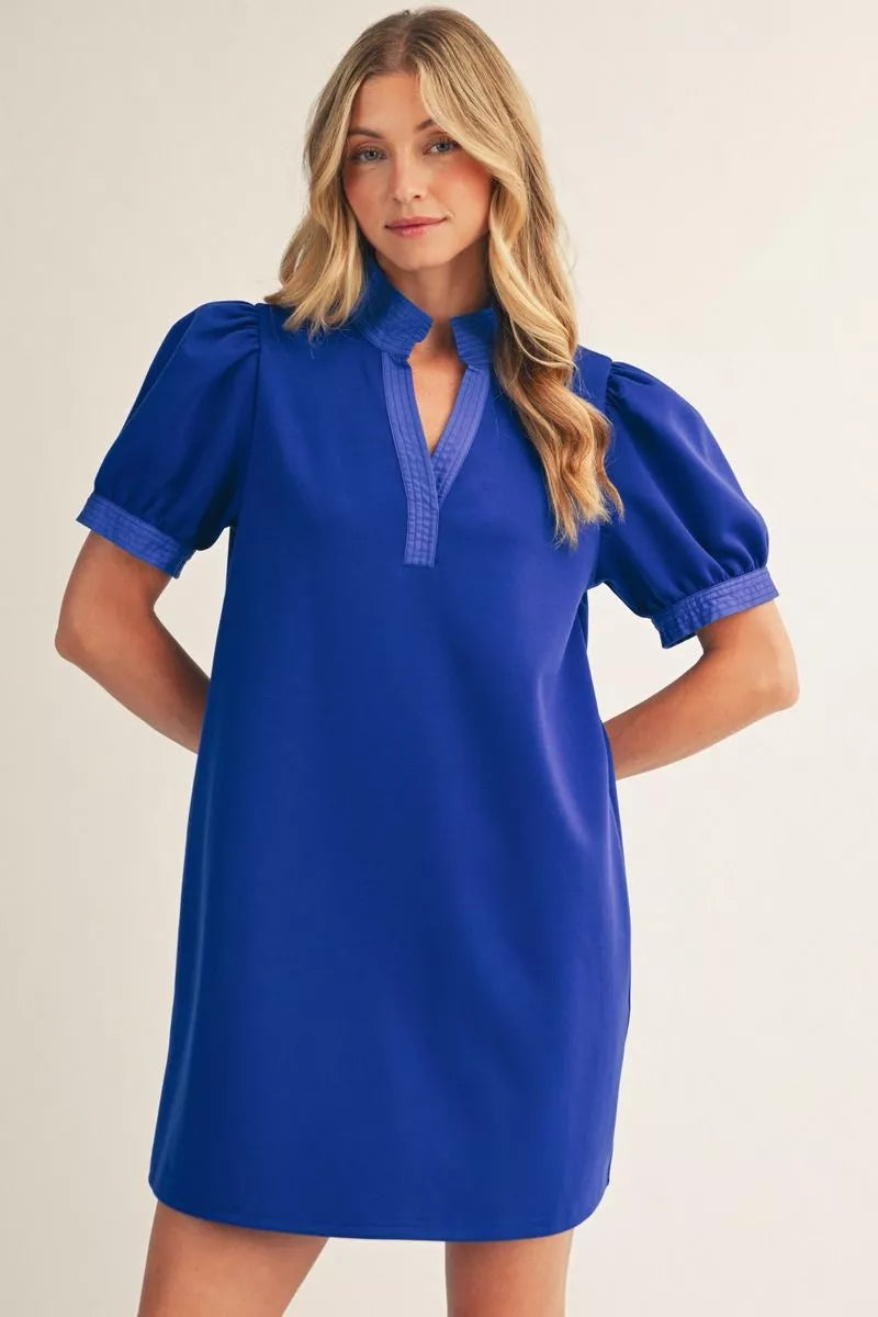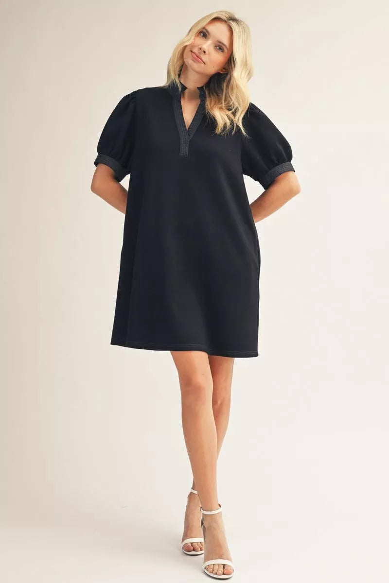 Short puff sleeves solid shift dress with standing neckline, side pockets.