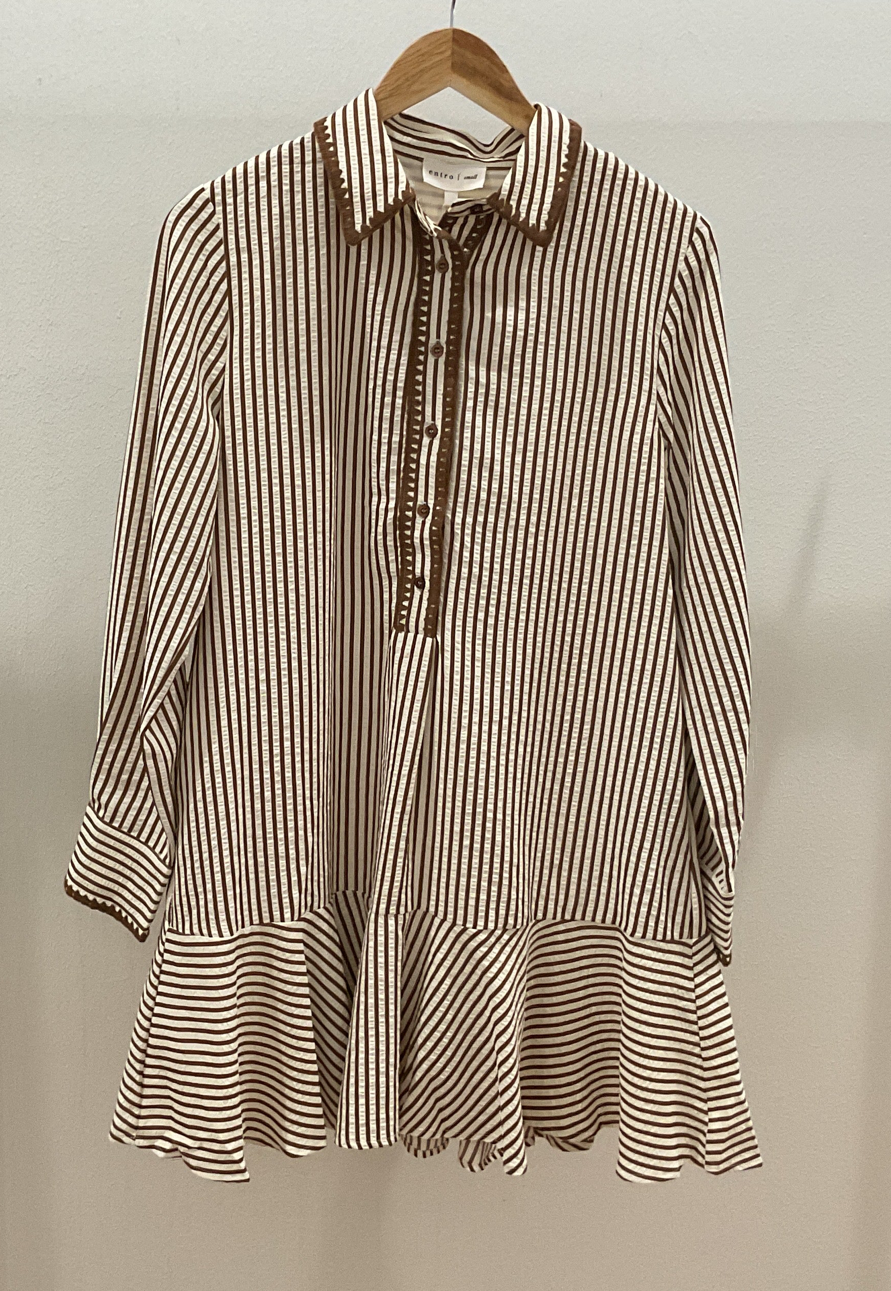 Striped long sleeve mini dress featuring embroidered trim along button placket. Button closure at front. Side pockets. Lined. Woven. Non-sheer. Lightweight.