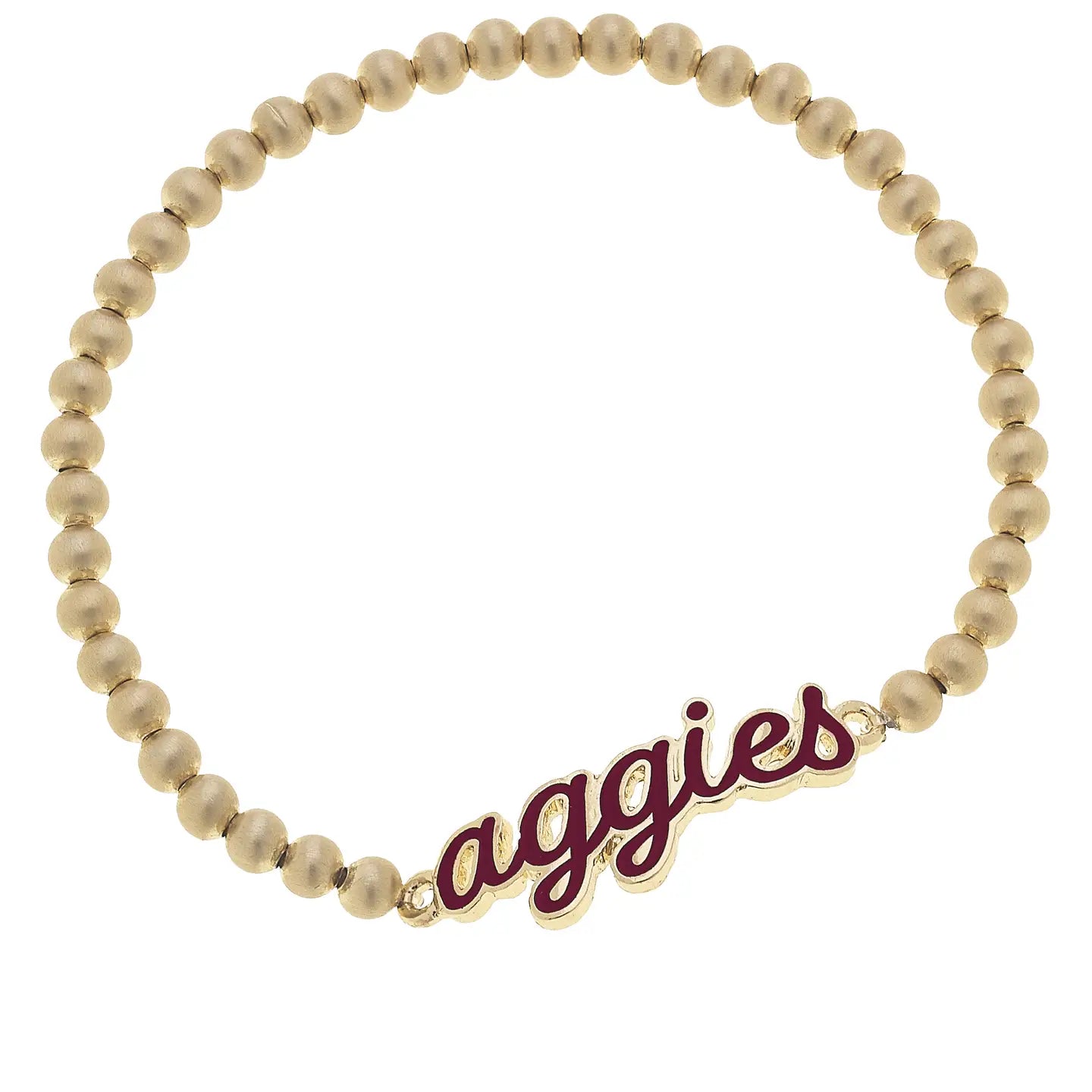 Cheer on your school with this versatile Texas A&M Aggies Enamel Script Stretch Bracelet in Maroon & Satin Gold! DETAILS: * Base Metal with Satin Gold Plating * Enamel Material * Stretch - One Size Fits Most * NCAA Officially Licensed