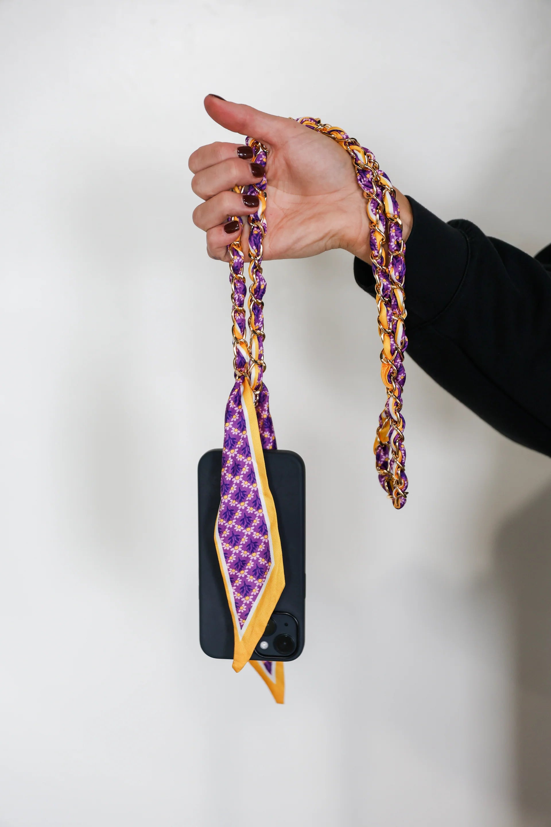 Elevate your bag or phone with the Victory Lap Gameday Chain Scarf Strap – a bold blend of fashion and function. This versatile strap features a gold chain interwoven with luxe patterned fabric. Whether you're headed to the stadium, the tailgate, or brunch with friends, this strap adds a pop of gameday spirit and a touch of elevated style to any crossbody bag or phone case.