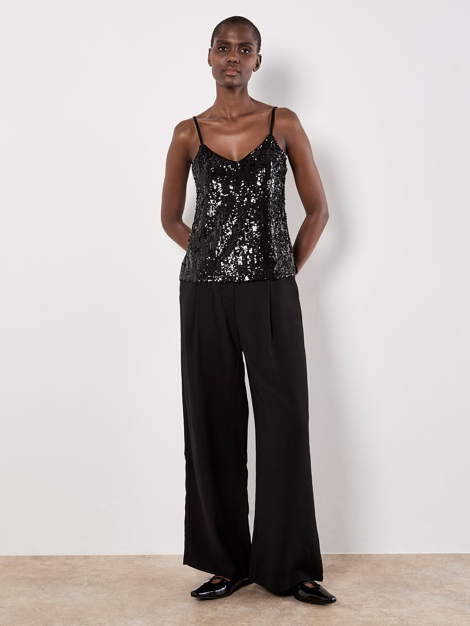 Get set to sparkle in this sequin-embellished camisole top. Lined for comfort, it features spaghetti straps and a flattering, plunging V-neck. Style this sequined cami with skinny-fit jeans and heels to take it from day to night.
