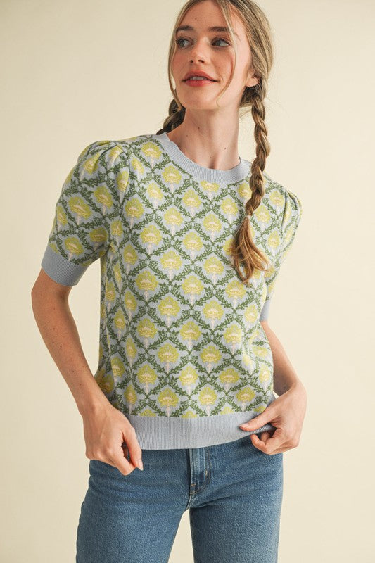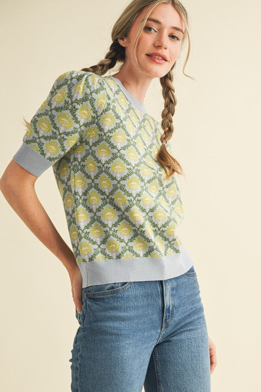 + Floral pattern short sleeve sweater + Round neckline + Short puff sleeves with ribbed cuffs + Vintage floral pattern + Relaxed fit pullover + Ribbed neckline, cuffs, and hem + Model is 5' 10.5" 32-24-36 and wears a S