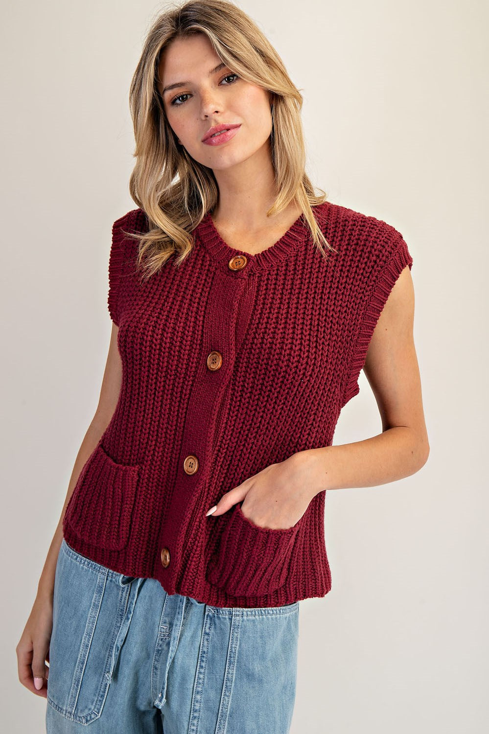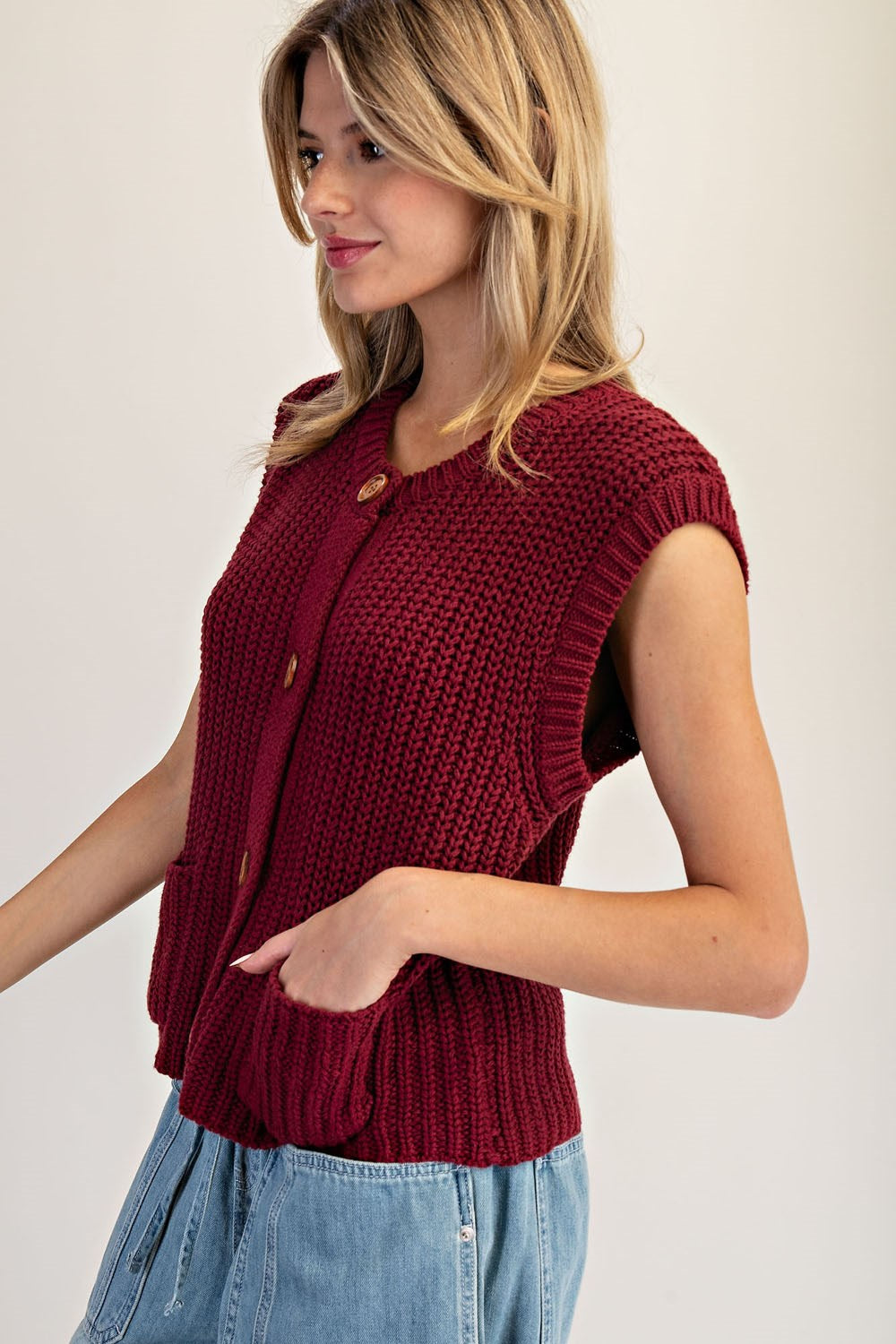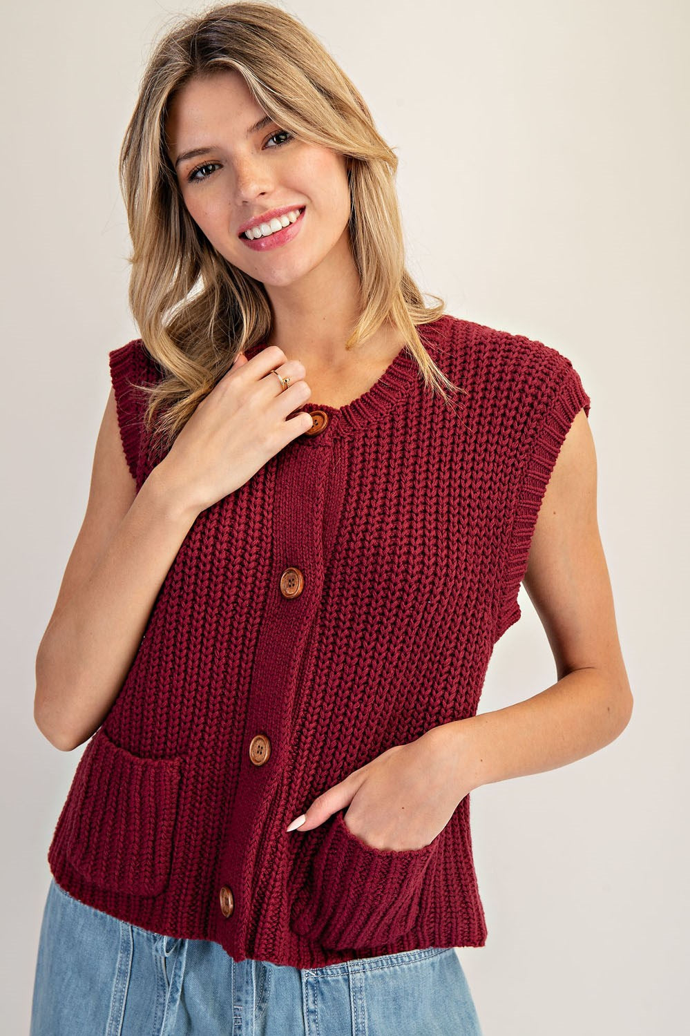 Product Detail: This chunky knit vest features a soft ribbed crew neckline, contrast button front closures, and patch front pockets, with cap sleeves and a textured stitch throughout for a cozy yet structured feel.