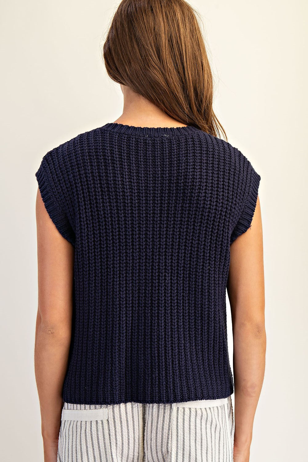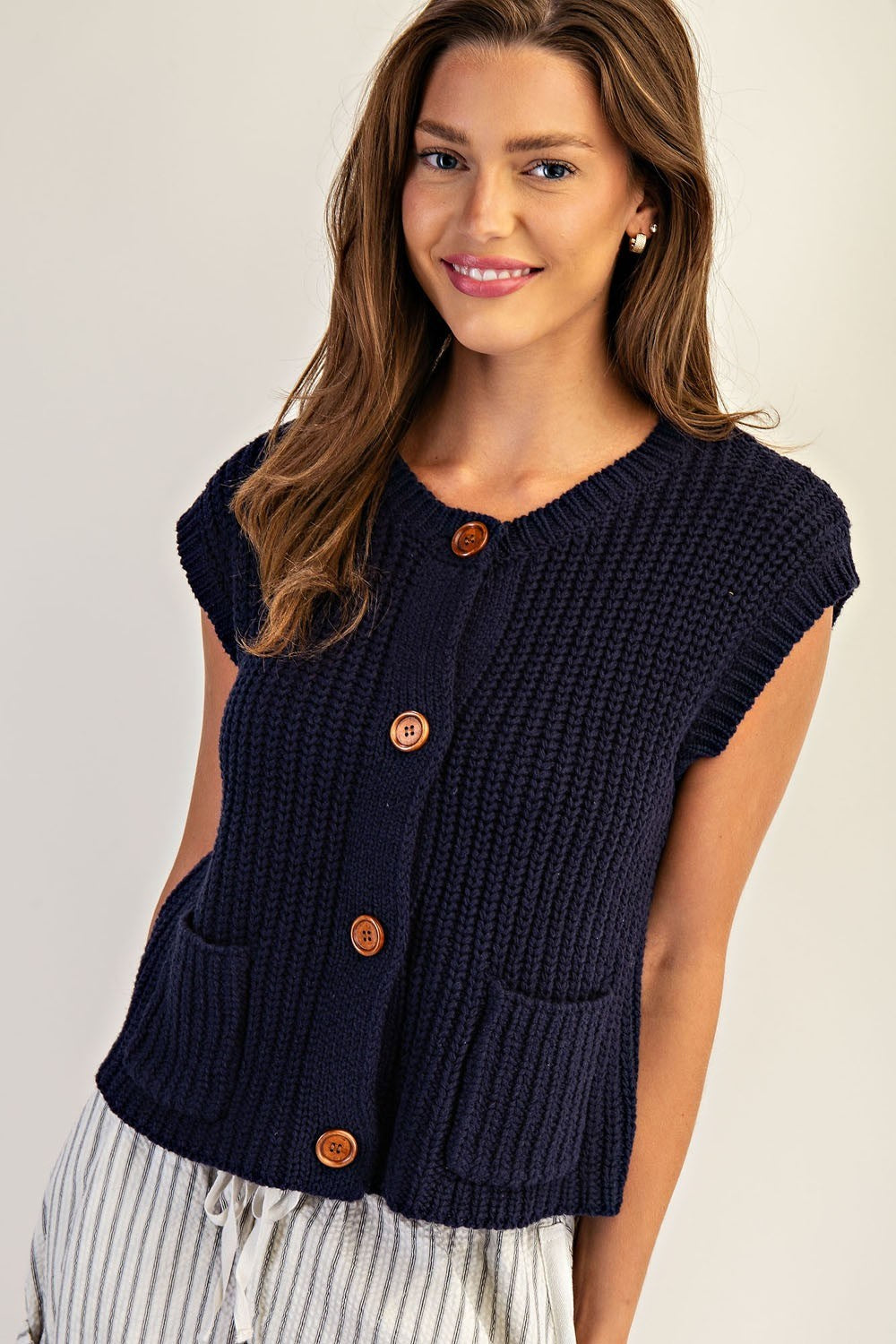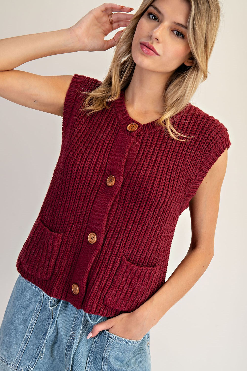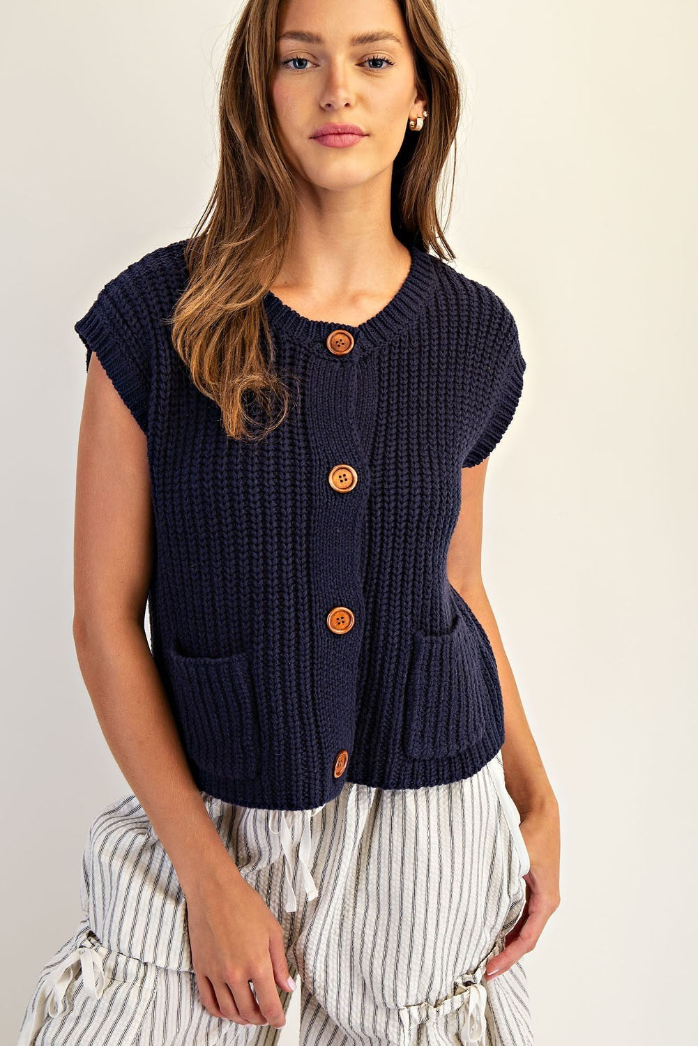 Product Detail: This chunky knit vest features a soft ribbed crew neckline, contrast button front closures, and patch front pockets, with cap sleeves and a textured stitch throughout for a cozy yet structured feel.