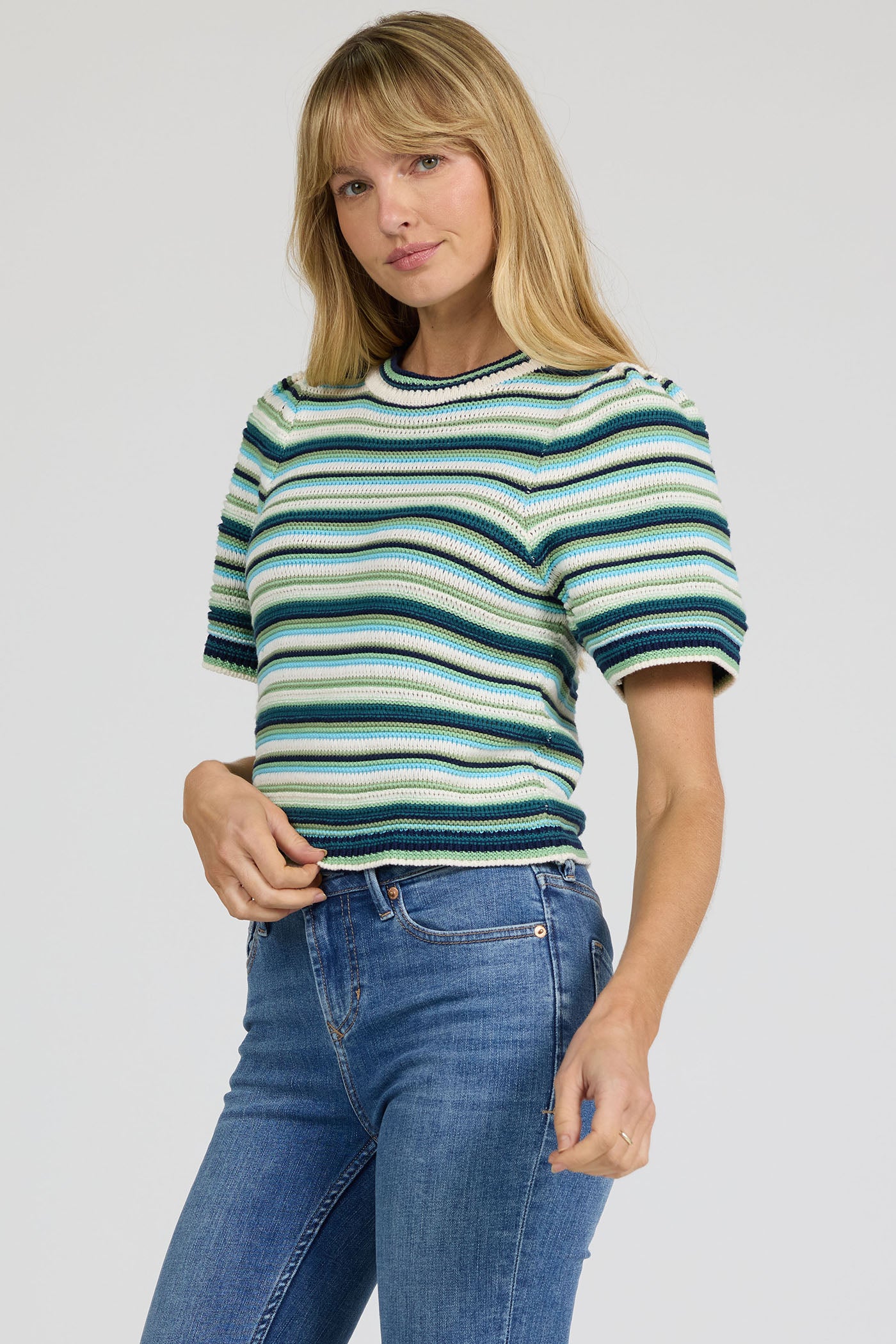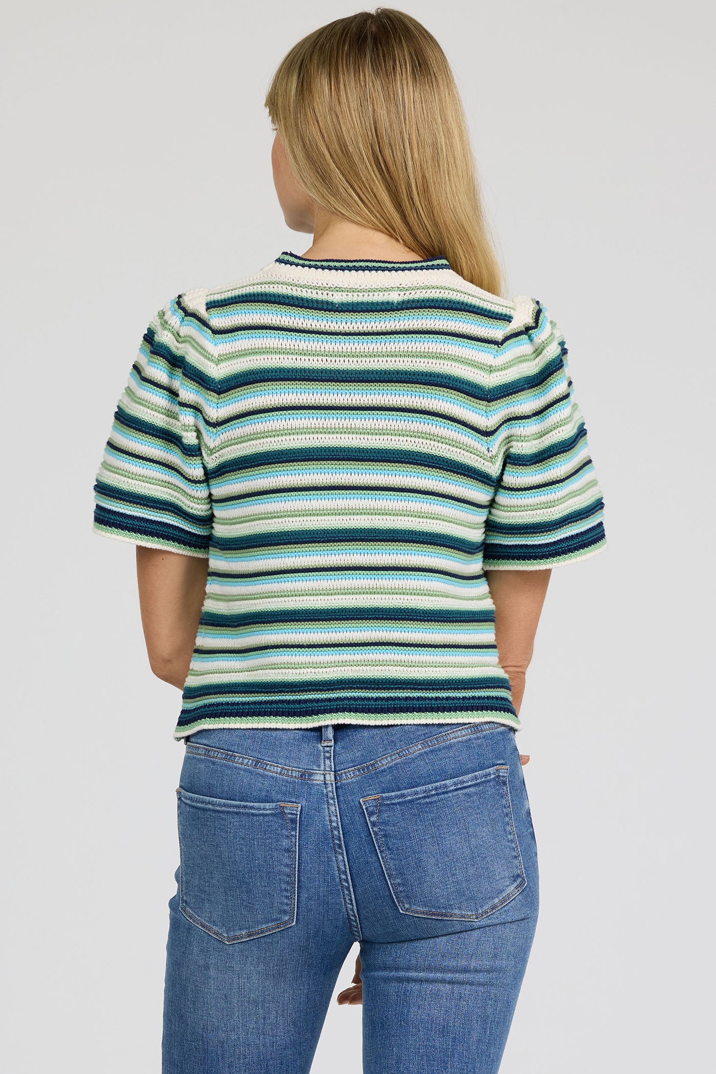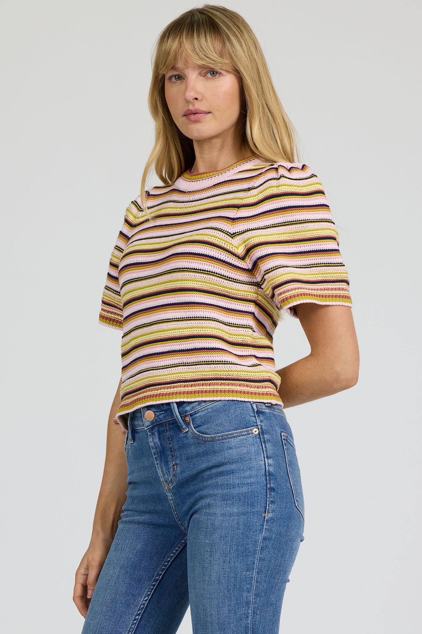 CREW NECK SHORT SLEEVE MULIT COLOR STRIPE SWEATER, CREW NECK, SHORT SLEEVE, CLASSIC, YARNS, Body length from HPS: 20 1/2", Sleeve length: 11", Bust: 33" (Size Small) 100% COTTON