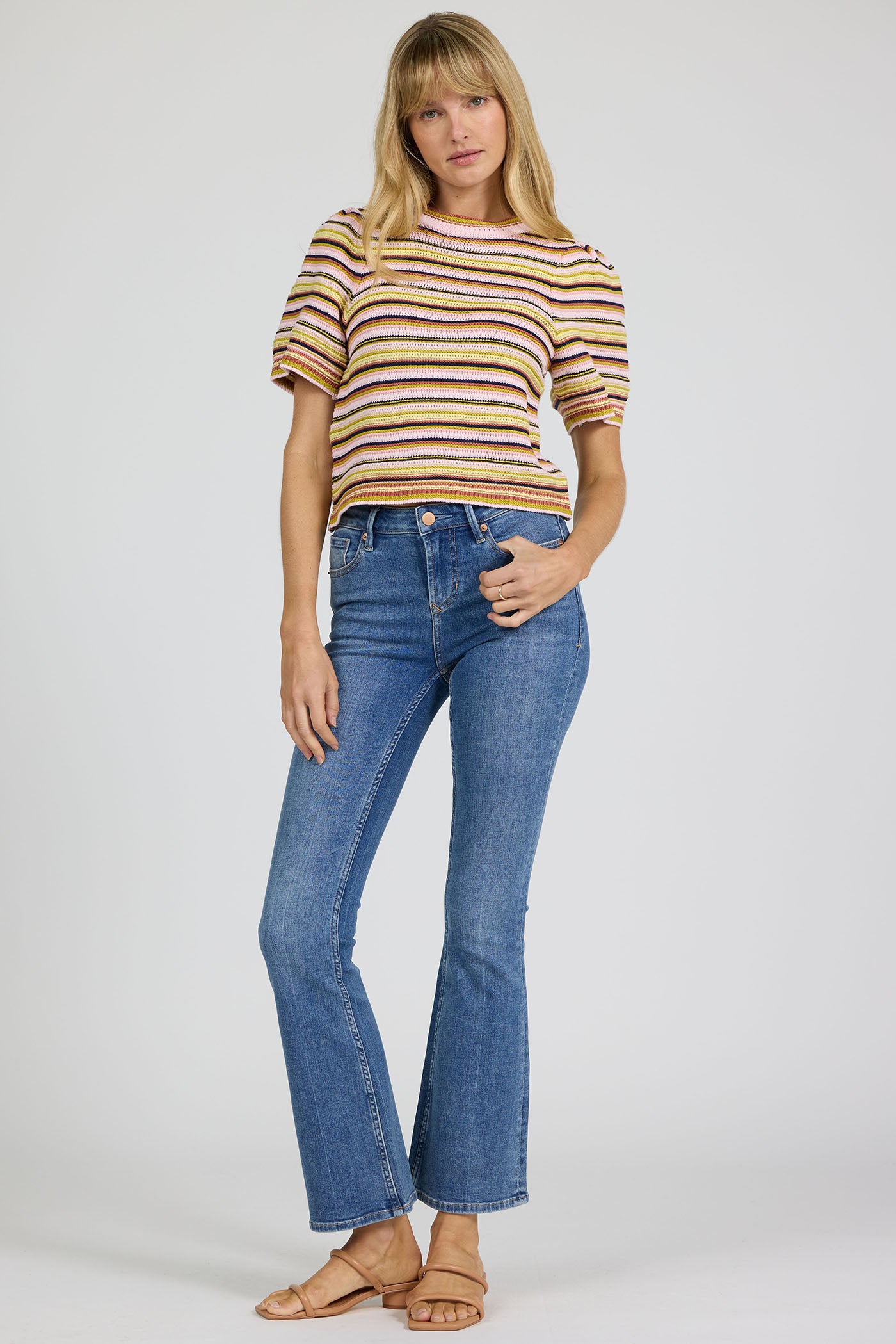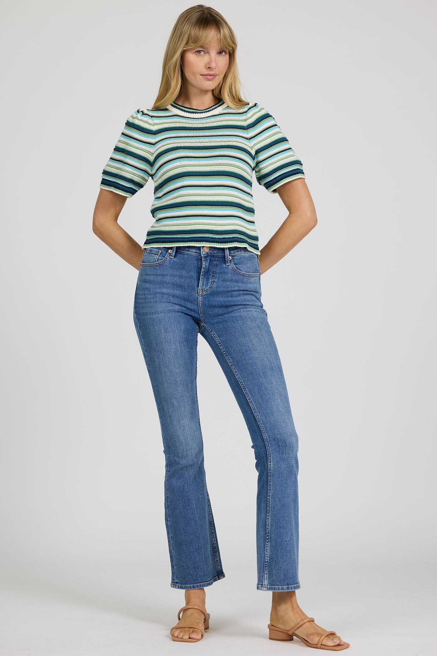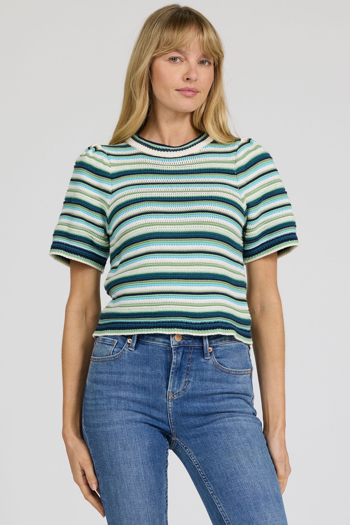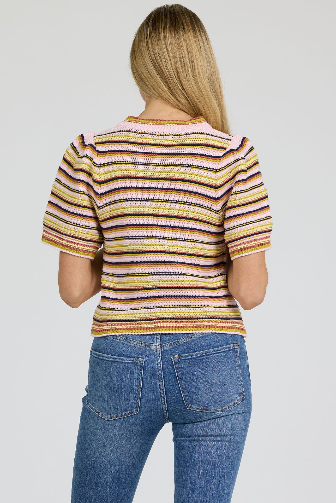 CREW NECK SHORT SLEEVE MULIT COLOR STRIPE SWEATER, CREW NECK, SHORT SLEEVE, CLASSIC, YARNS, Body length from HPS: 20 1/2", Sleeve length: 11", Bust: 33" (Size Small) 100% COTTON