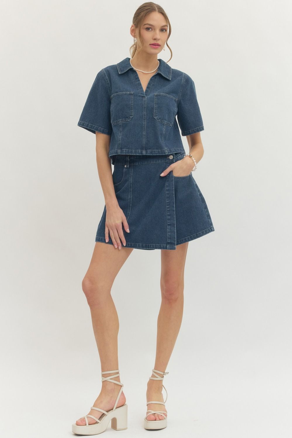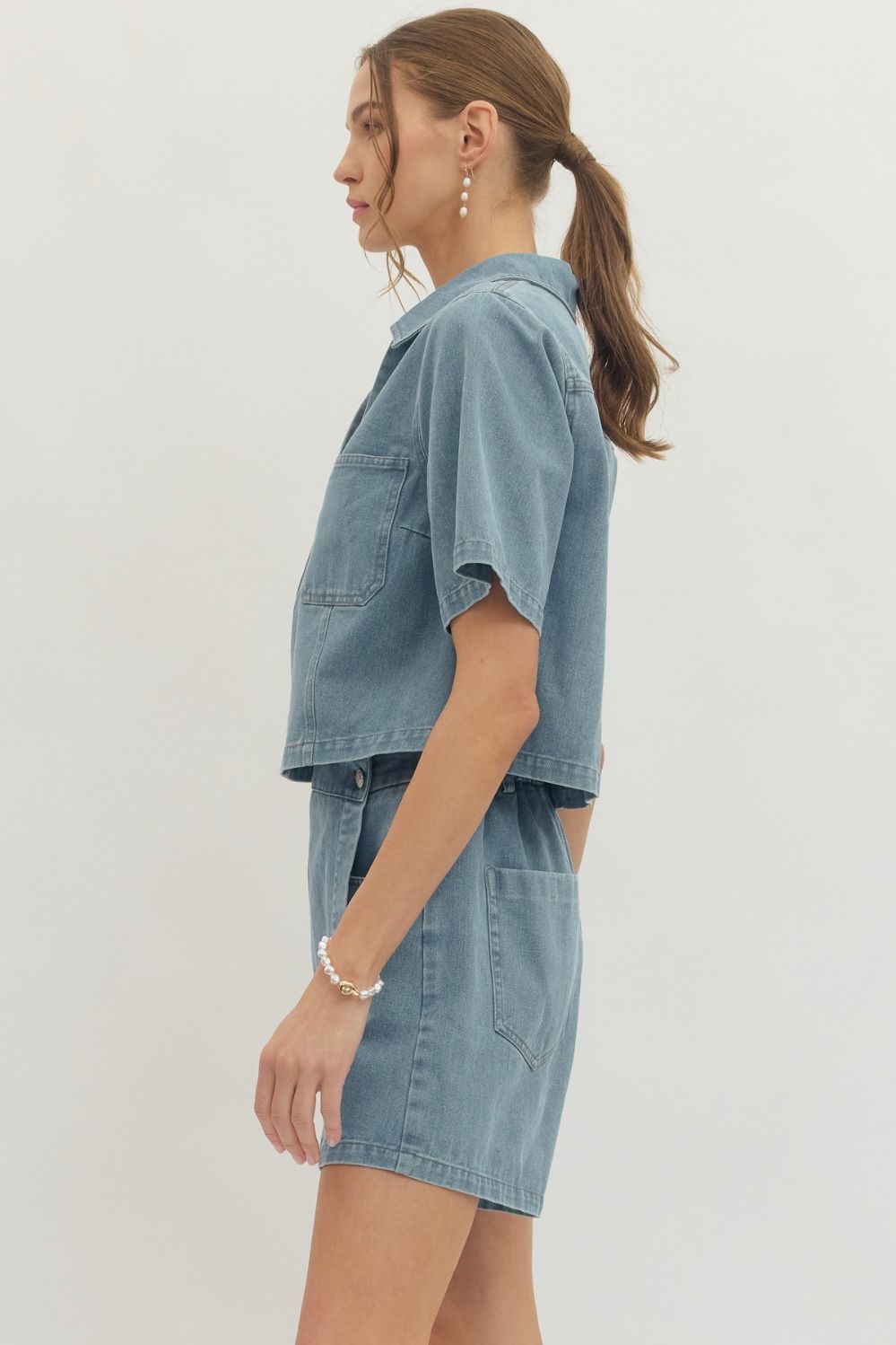 Solid short sleeve denim woven top featuring spread collar V-neck. Patch pockets at front. Back yoke with center pleat detail. Unlined. Woven. Non-sheer. Lightweight.