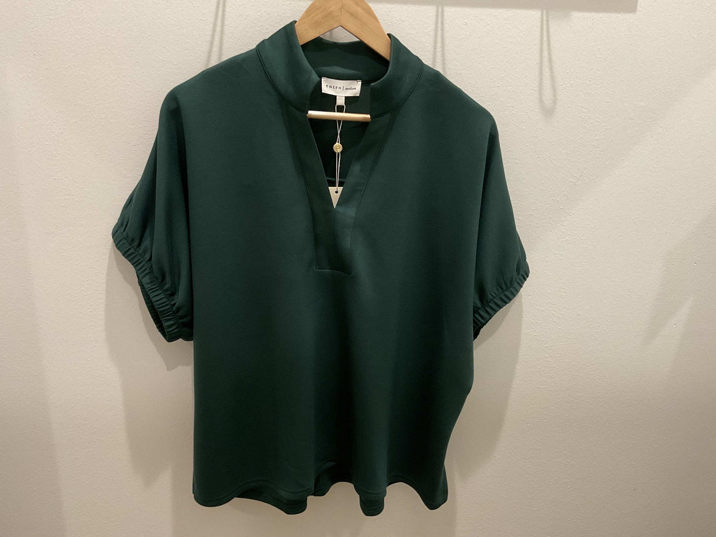 Solid short sleeve top featuring split V-neck with collar band. Elasticated sleeve openings. Back yoke with pleat detail. Unlined. Knit. Non-sheer. Lightweight.