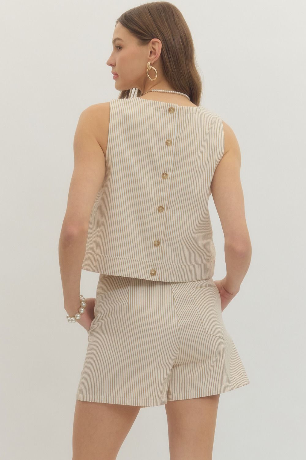 Striped sleeveless crop top featuring back button closure. Unlined. Woven. Non-sheer. Lightweight.